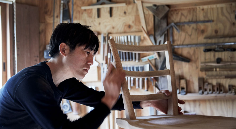 弟子上がり後、鎌倉で10 年にわたり大工として現場を経験し、「見て盗む」職人気質を習得。35 歳で家具職人として再出発し、地元・八女へ戻ります。